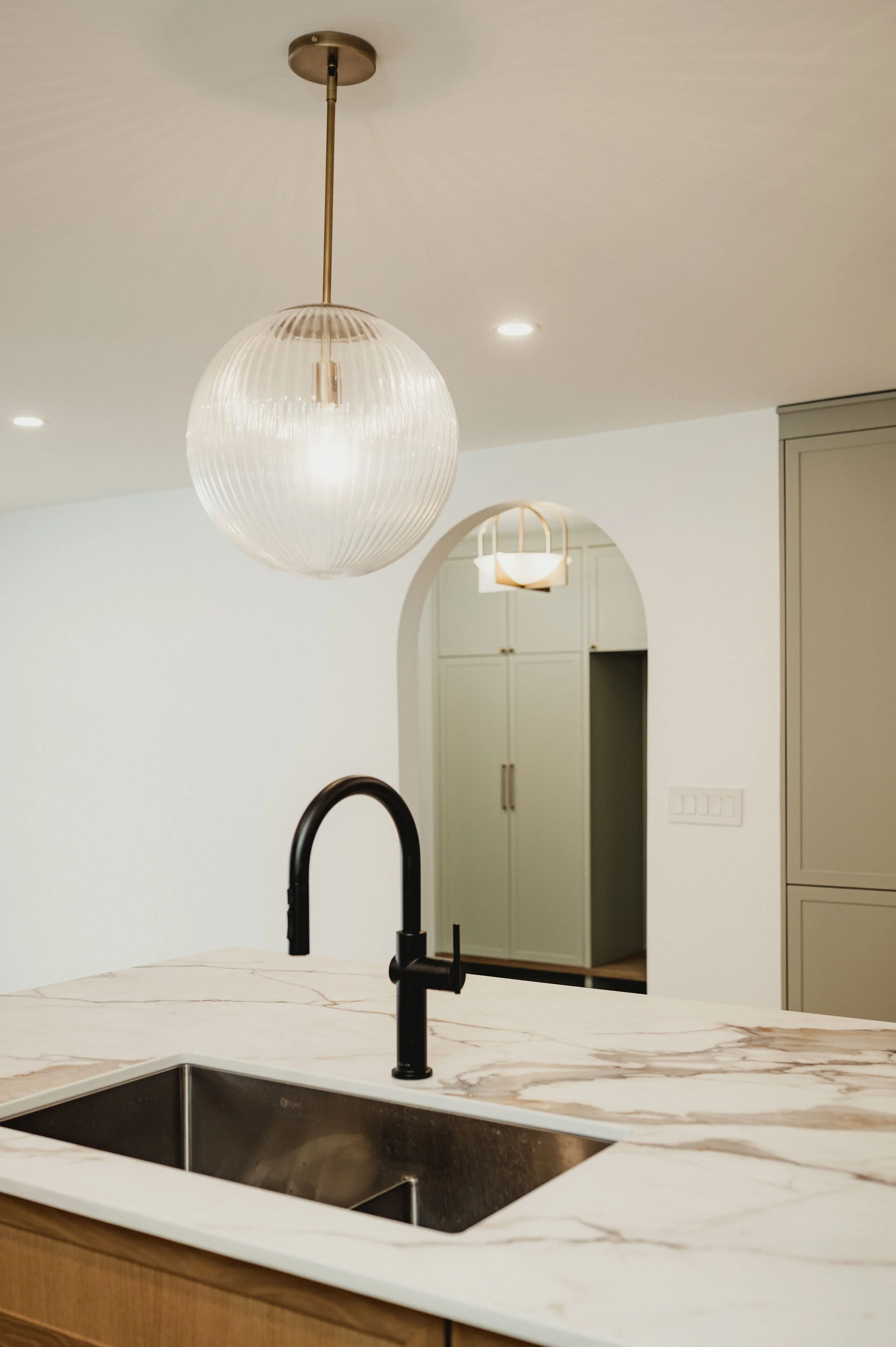Natural materials, sculptural lighting, and thoughtful details create a harmonious space that balances beauty and practicality, resulting in a warm, inviting home tailored to the homeowners' vision.